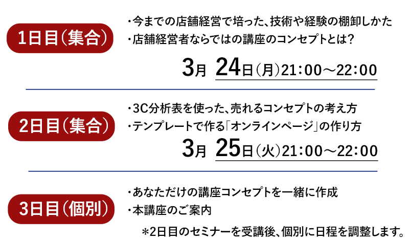 「1日目」又は、「2日目」を欠席の方には、録画したデータをお送りします。